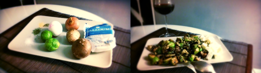 Sauté the onions in a bit of oil or butter and add the cleaned (and halved) sprouts to it. I like them raw-ish, so I just blanche them before throwing them into the pot with the onions. Stir for a little while until … basically whenever you feel they are done to perfection.